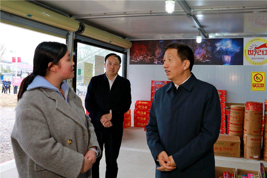 (2月25日下午,市委書記許忠建在城區(qū)檢查督導(dǎo)安全生產(chǎn)工作。圖為許忠建在炫通煙花鞭炮店與門店老板深入交流,詳細(xì)了解煙花爆竹儲(chǔ)存規(guī)范、消防設(shè)施配備及日常安全管理情況。懷化日報(bào)全媒體記者 彭軍 攝)