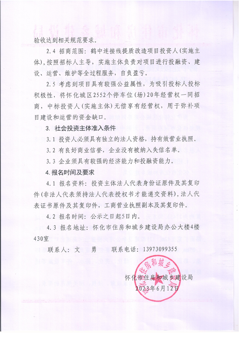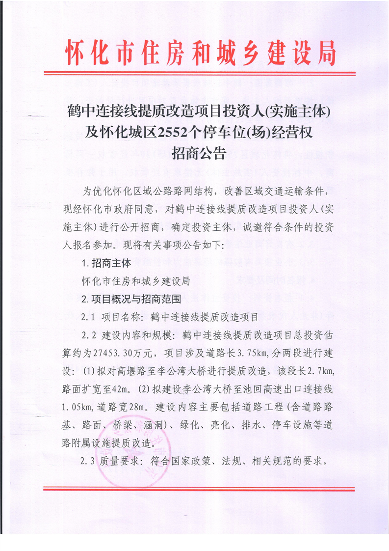 鶴中連接線提質(zhì)改造項(xiàng)目投資人(實(shí)施主體)及懷化城區(qū)2552個(gè)停車(chē)位(場(chǎng))經(jīng)營(yíng)權(quán)招商公告