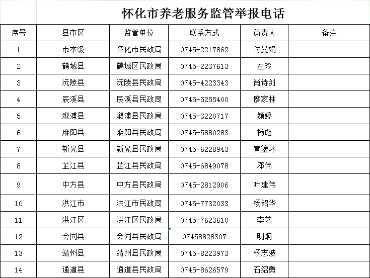 為響應社會為老服務需求,提升養(yǎng)老服務質量,加強對養(yǎng)老機構和養(yǎng)老從業(yè)人員的監(jiān)督,回應民眾關切,推動養(yǎng)老事業(yè)和養(yǎng)老產業(yè)協(xié)同健康發(fā)展,經市縣民政部門確認,現(xiàn)將懷化市縣兩級養(yǎng)老服務熱線和監(jiān)管舉報電話,在懷化轄區(qū)內依法辦理法人登記并在民政部門備案且通過消防審驗的養(yǎng)老機構名單予以公布并接受社會各界的監(jiān)督。