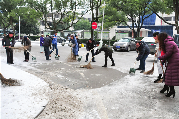 1月26日,市第一人民醫(yī)院的黨員志愿者與醫(yī)務人員在醫(yī)院內鏟除冰雪,確保行人安全通行。 (曾悅 攝)