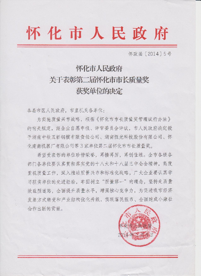 自2011年頒發(fā)首屆懷化市市長質(zhì)量獎以來,全市各級各部門,各企業(yè)迅速掀起了質(zhì)量興市熱潮,廣泛開展了學(xué)習(xí)貫徹落實以《卓越績效評審準(zhǔn)則》國家標(biāo)準(zhǔn)和市內(nèi)外先進企業(yè)成功質(zhì)量管理經(jīng)驗為重點的質(zhì)量強市活動,我市質(zhì)量工作得到了很好的發(fā)展,為進一步推進質(zhì)量興市戰(zhàn)略,2013年我市根據(jù)《懷化市市長質(zhì)量獎試行管理辦法》的有關(guān)規(guī)定,經(jīng)企業(yè)自愿申報、評審委員會評議,市人民政府決定,授予湖南中鐵五新鋼模有限責(zé)任公司、湖南恒光科技股份有限公司、懷化建南機器廠有限公司等3家單位第二屆懷化市市長質(zhì)量獎。