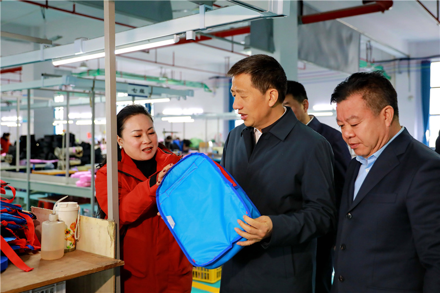 (3月5日,市委書記許忠建在麻陽調研督導“十五五”開好局起好步工作。圖為許忠建在麻陽森佳箱包有限公司調研箱包產(chǎn)業(yè)發(fā)展情況。)