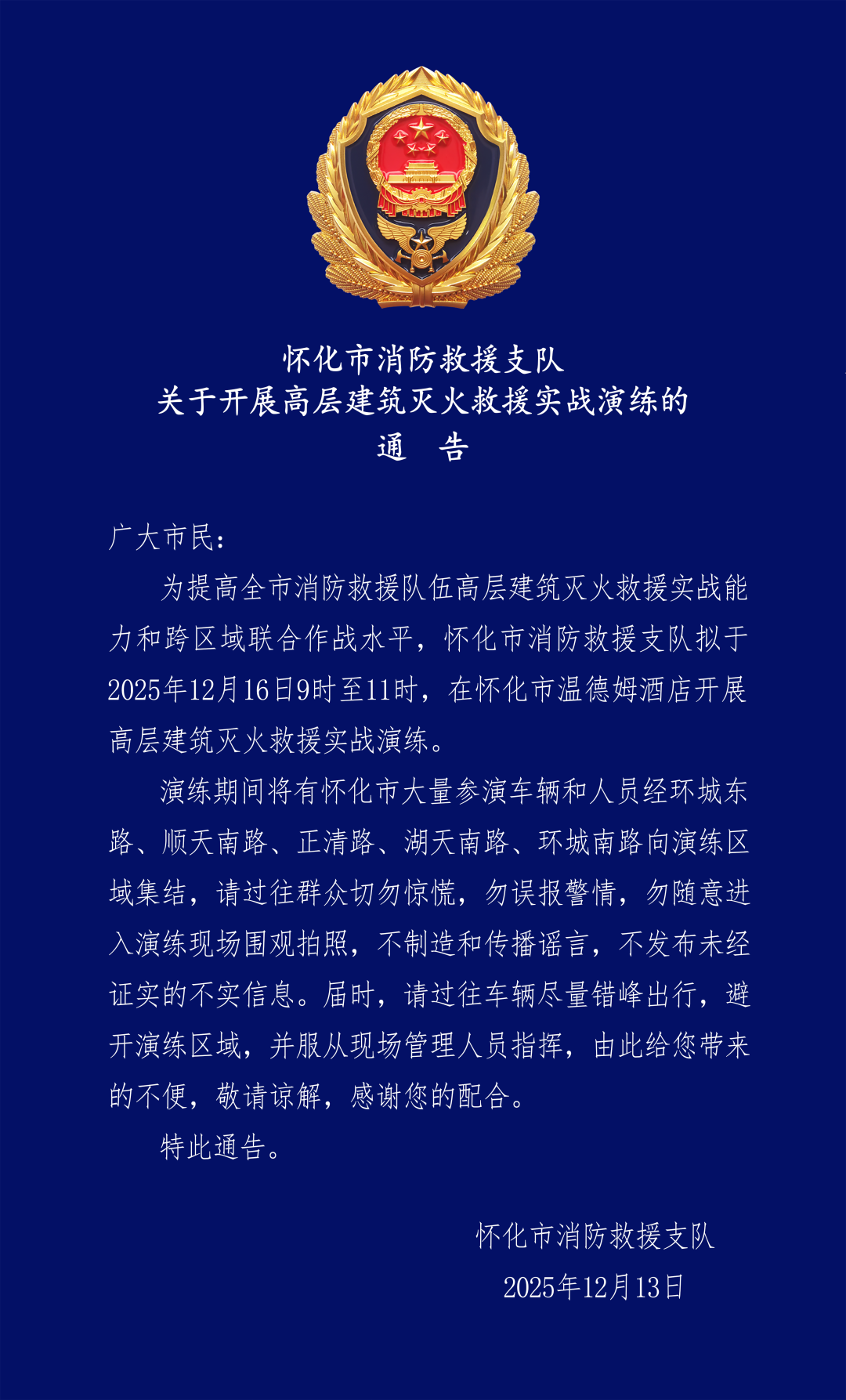 懷化市消防救援支隊關于開展高層建筑滅火救援實戰(zhàn)演練的通告