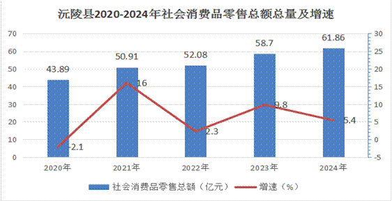 全縣完成社會消費品零售總額61.86億元[4],同比增長5.4%。全年居民消費價格指數(shù)(CPI)為100.2%;服務(wù)項目價格指數(shù)為100.2%。