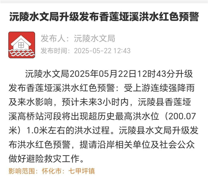 沅陵水文局升級發(fā)布香蓮埡洪水紅色預警